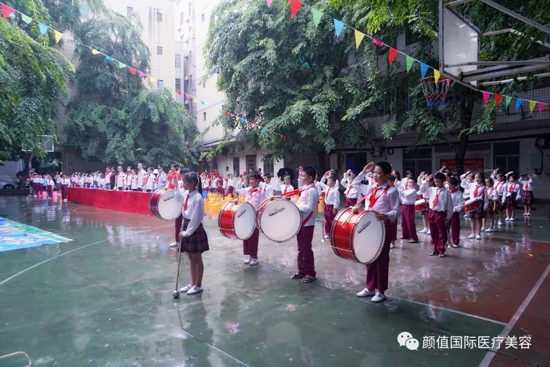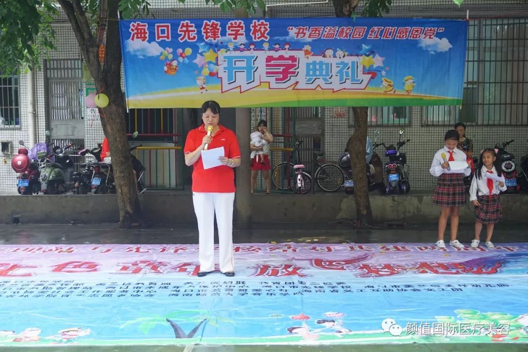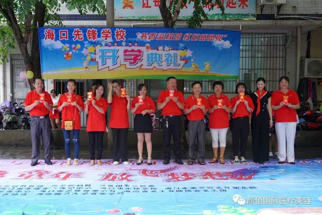 今天是本学年度的第一个星期一,学校例行举行升国旗仪式,孩子们陆续汇聚到了升旗台前。不过,今天除了孩子们之外,还有一群特别的客人,他们是由海南耀颜值医美副总经理何芬女士带领的“圆梦天使”爱心公益小分队,他们冒雨前来参加孩子们开学典礼,并为孩子们献上爱心和祝福。