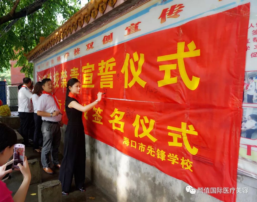 开学典礼最后环节,何芬女士与先锋学校全体师生们在学校禁毒宣誓宣传语下签名,承诺:远离毒品,珍爱生命;珍惜学习机会,创造美好人生!