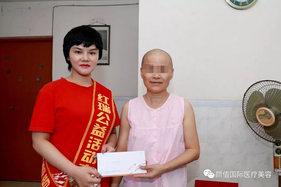 在走访慰问过程中,耀颜值医美总经理张丽女士以及副总经理何庭嬅女士,亲切地与患者进行交谈,并分别为她们送上了现金慰问,鼓励患者要热爱生命,树立战胜病魔的信心和勇气。